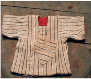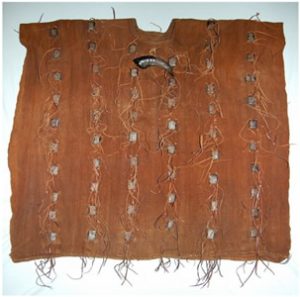 Subsequently, the Hu Ronko fabric attracted chiefs, secret societies, hunters, warriors and blacksmith, who started using the garment for spiritual protective powers, as they engaged in dangerous pursuits. They are still worn today by male initiates in the course of their initiation into adulthood and by Limba, and other indigenous paramount Chiefs at the culmination of their ceremonies of installation. It is strongly believed that the garment especially those made with embedded spiritual powers should never be washed. Some of them will have animal skins, bones, ivory, and protective amulets, likely to contain scripts from the Quran. The example below has a number of small leather rectangles, or amulets, sewn onto it, along with leather tassels, a piece of horn, and a coiled basketry rosette. Such shirts were worn by hunters and others engaged in dangerous pursuits – this is described as a war-shirt.